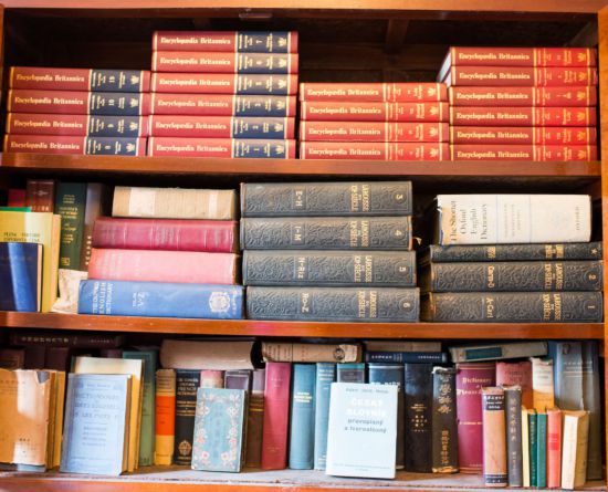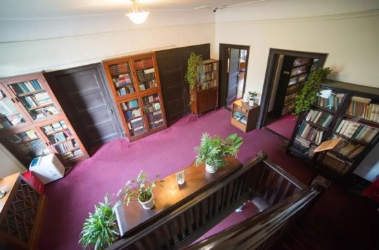 故居二樓的過廳,左側書柜里存放的主要是外文書和工具書,包括農學、醫學、植物學和專業的測繪詞典等類別。巴金精通英語、俄語,并能通過日文、德文、朝鮮文、西班牙文、法文等文字進行閱讀。