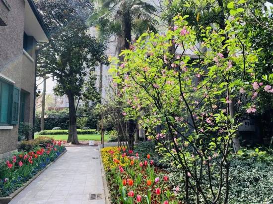 主樓通向花園的步道旁,種有雞爪槭、繡球花、垂絲海棠、牡丹、山茶等多種植物,巴金經常在這里散步?;▓@中玉蘭、櫻花等花木多為巴金親自栽種。