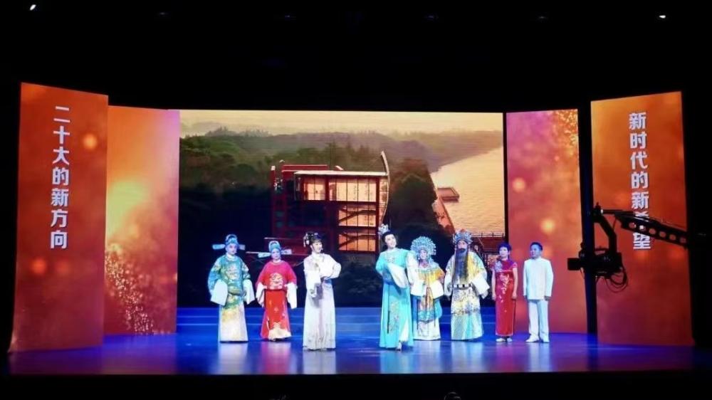 “滾滾浪潮,大江北望,三十而立的新閔行。創新又開放,生態人文強,建設現代化的新征程,攜手奔赴譜輝煌……”舞臺上,京劇、滬劇、越劇、黃梅戲四劇種聯動,共同唱響紫竹調《大江北望》。