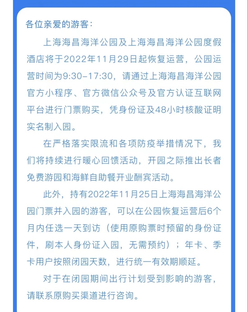 此外,持有2022年11月25日上海海昌海洋公園門票并入園的游客,可以在公園恢復運營后6個月內任選一天到訪(使用原購票時預留的身份證件,刷本人身份證入園,無需預約);年卡、季卡用戶按照閉園天數,進行統一有效期順延。對于在閉園期間出行計劃受到影響的游客,可聯系原購買渠道進行咨詢。