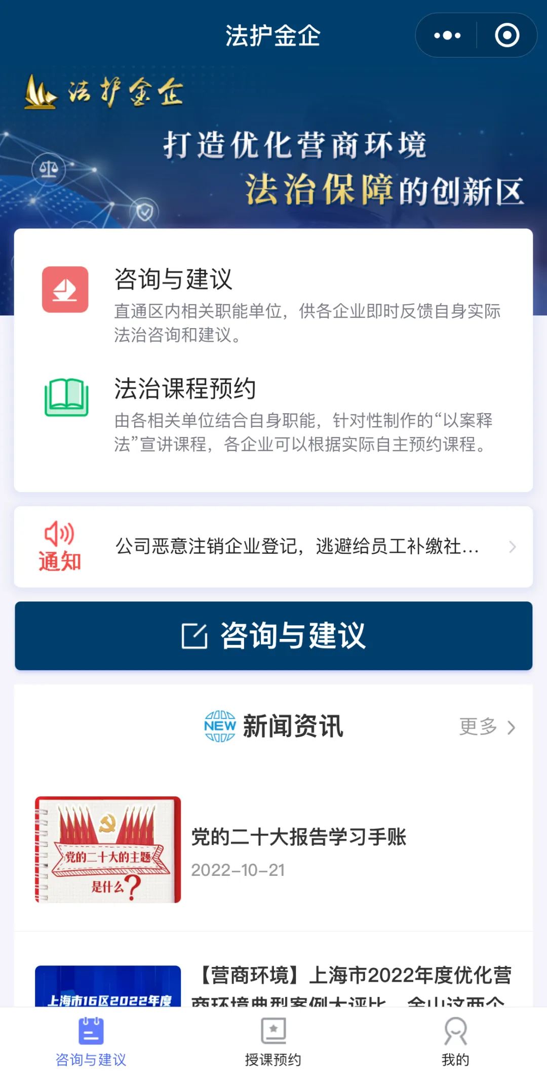 線上打造“法護金企”微信小程序服務平臺,構建企業和部門直接溝通平臺。企業可以針對四大類21個具體事項在線向前述9個部門提出需求和建議,由部門進行反饋和答復,并由企業進行追問和評價。同時,平臺開放線上預約授課功能,對法治宣講團的宣講課程企業可以線上約課,并在課后評價。目前,平臺已向全部171家法治化營商環境聯系點企業開放,實現線上派單和預約點課。目前,“法滬金企”微信小程序正擴容增能,與金企服務云平臺建立鏈接,將進一步實現對全區800余家企業的全面開放。