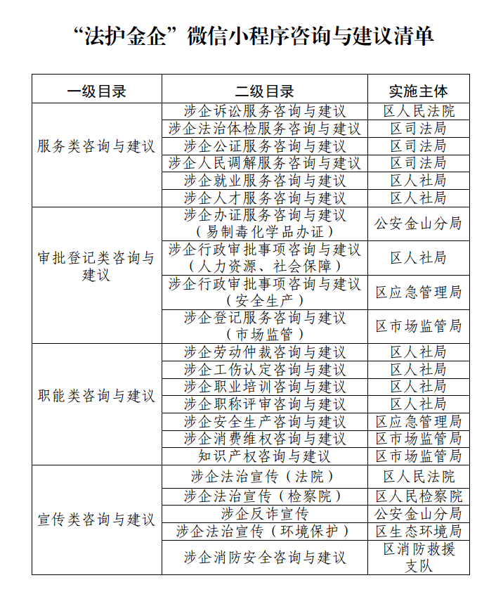 金山區通過“三團一平臺”的服務載體,嵌入三個一”的服務機制,開創了組團式聯系服務企業的新模式。法治宣講、法治咨詢和法治體檢三個服務團,有效整合了區政法各單位和重點執法部門的資源,以“點單式”的按需選擇讓服務變得更加精準高效;“法護金企”微信小程序,開拓了一條企業和部門的交流新路徑,把服務的主動權交給了企業,真正做到了“無事不擾、有求必應”。