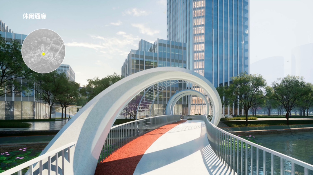 規劃將自然景觀延伸至園區內部,自中心公園到南側總部大樓形成一道綠谷。