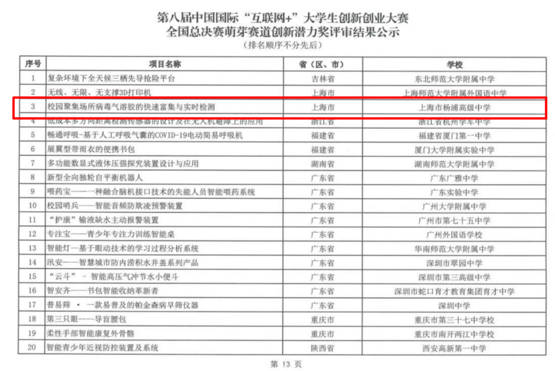 近日,第八屆中國國際“互聯網+”大學生創新創業大賽落下帷幕,楊浦高級中學的項目《校園聚集場所的病毒氣溶膠快速富集與檢測》榮獲國賽萌芽賽道的最高獎——創新潛力獎。這也是繼上一屆上海理工大學附屬中學之后,楊浦高中學子第二次摘得該項榮譽。