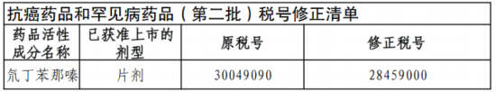 (點擊查看大圖)“抗癌藥品和罕見病藥品清單(第二批)”中罕見病藥品制劑序號9“氘丁苯那嗪”按確定的稅號執行。詳見下圖↓
