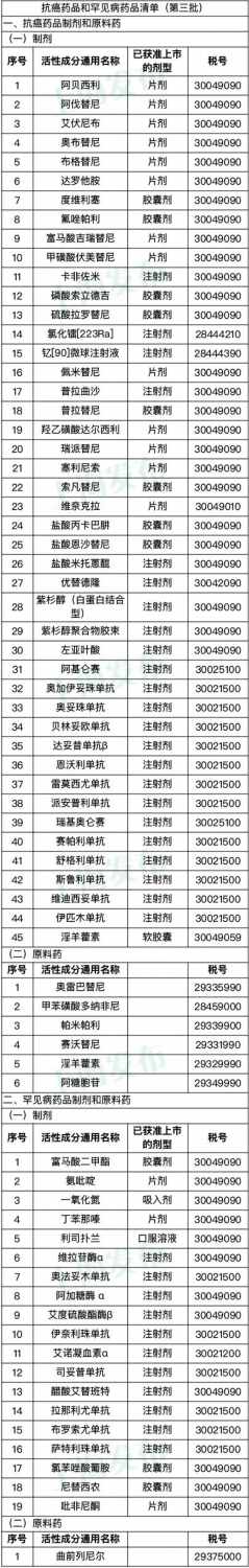 第三批適用增值稅政策的抗癌藥品和罕見病藥品清單公布