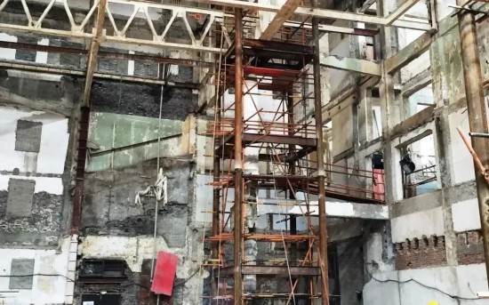 此次修繕對20多米高的北外墻采用了錨桿靜壓樁進行加固,對新地下室基坑北側設置了永久性的圍護結構,對暫時無法拆除的臺口結構采用扛抬架空的辦法,對呈片狀的北墻增設了橫向及斜向的支撐,確保了地下室拆除和新建過程中北外墻的穩定和安全。