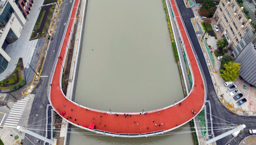 蘇州河橋梁家族再添新成員。1日下午,安遠路跨蘇州河橋新建工程實現全線通行。作為一座慢行橋,安遠路跨蘇州河橋不僅能滿足市民通行及非機動車推行過河的需求,還能為游人提供休憩場所。