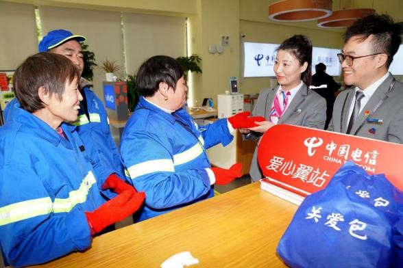 不久前,江西中路營業廳的愛心翼站成功開展“相約星期二”幸福課堂冬日送溫暖主題活動,現場邀請到附近工作的環衛工人、快遞小哥、城管一同參加,當天門店工作人員為前來參與活動的人員送上了溫暖福利禮品,驅散了冬天嚴寒。長期以來,上海電信江西中路營業廳為戶外工作者敞開“回家的大門”,第一時間為需要幫助的人伸出援手,解決了他們的燃眉之急。