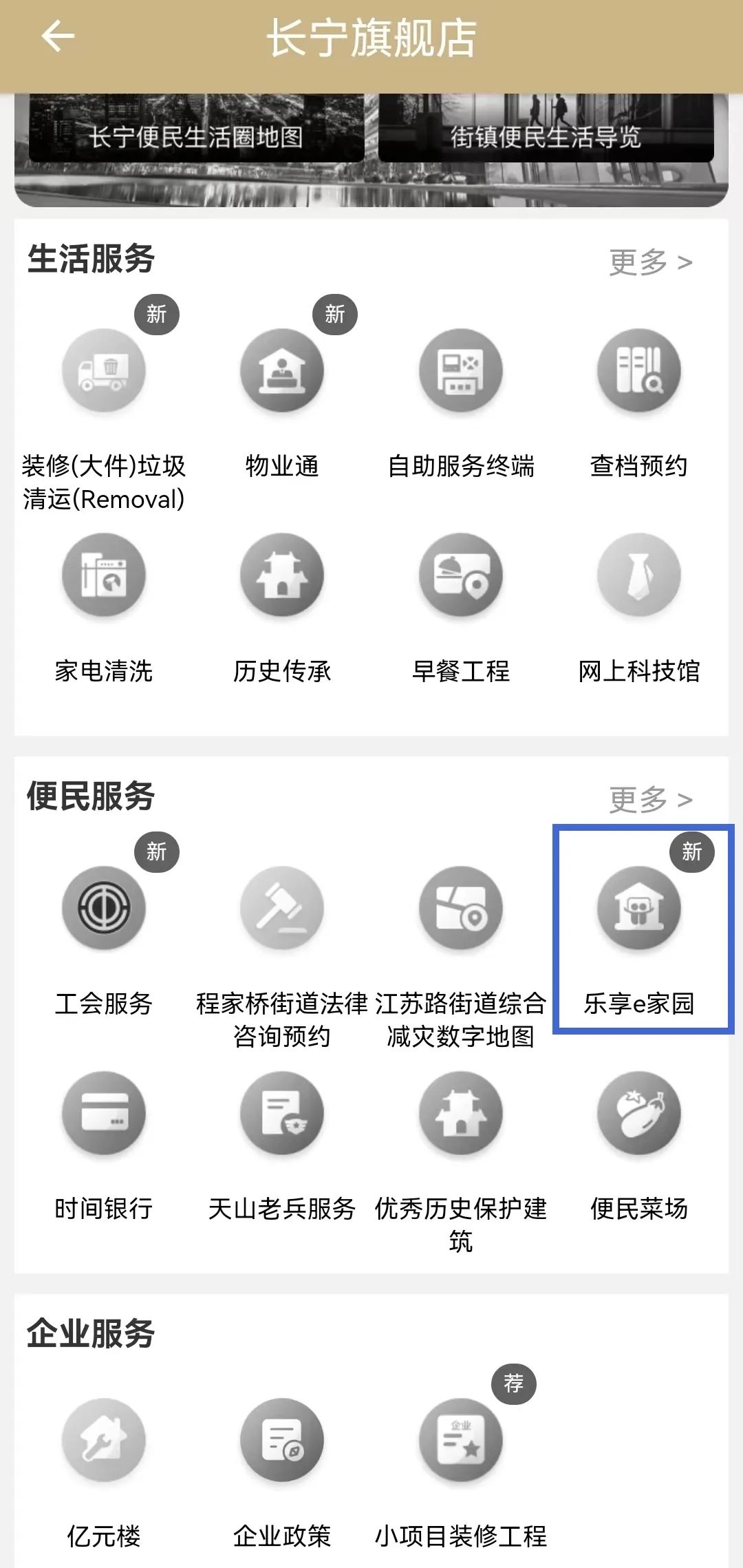 打開“隨申辦”APP,在搜索框中搜索“長寧旗艦店”,進入后,點擊“便民服務”下的“樂享e家園”即可。