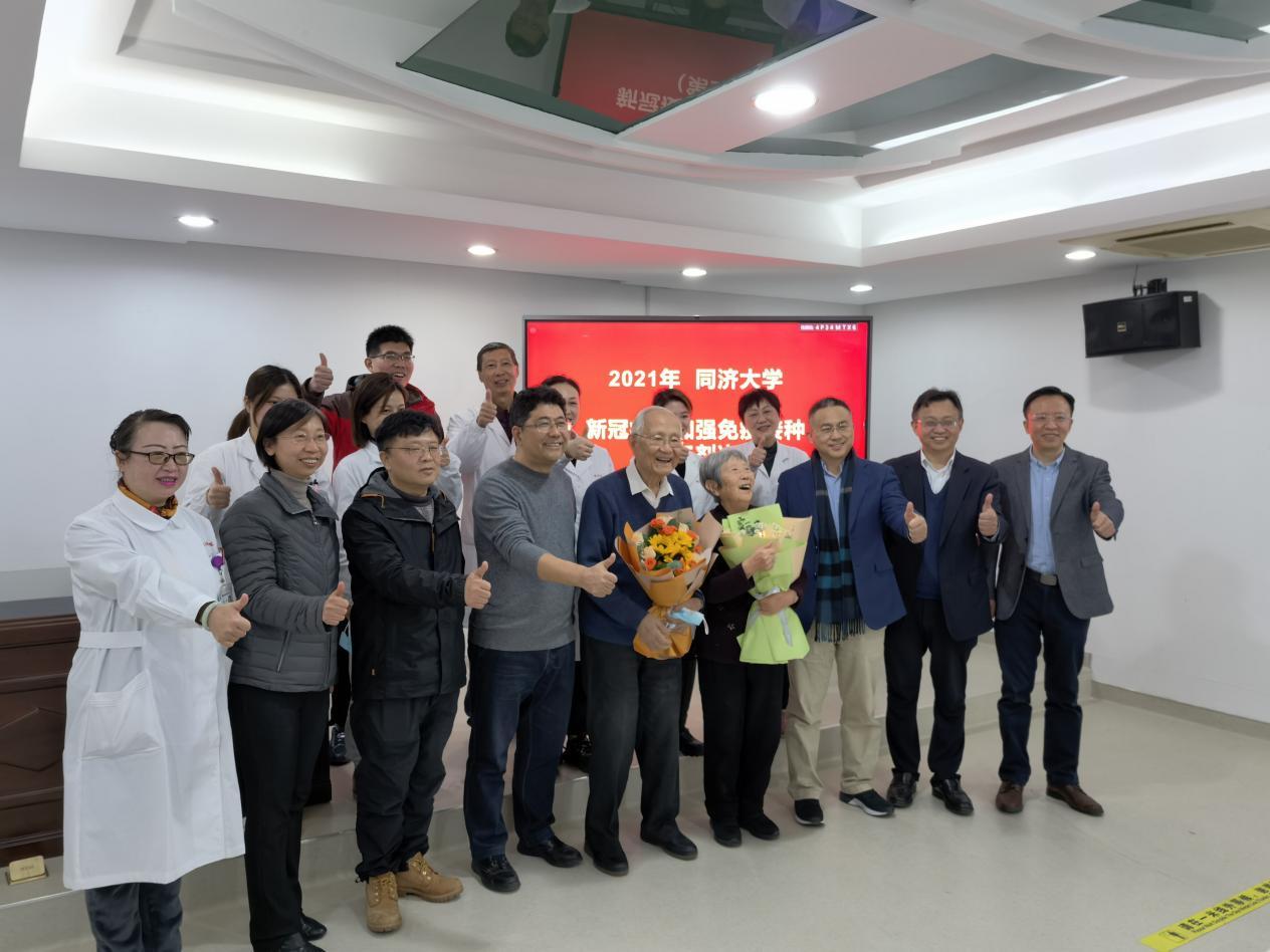 86歲的汪品先院士和夫人一起完成疫苗加強針接種后,與大家合影。楊浦區融媒體中心供圖