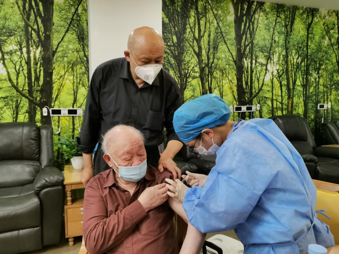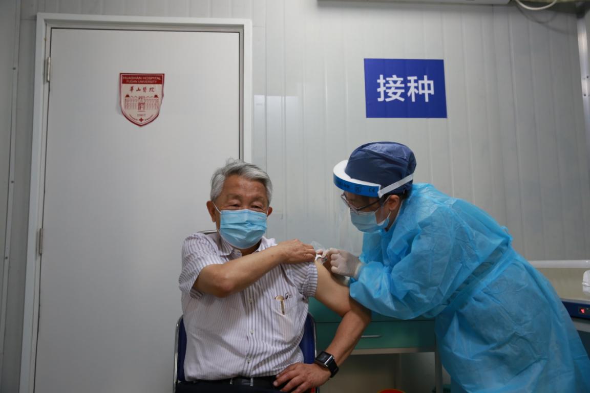 81歲的中國工程院院士、復旦大學附屬華山醫院神經外科主任周良輔進行疫苗接種。 華山醫院供圖