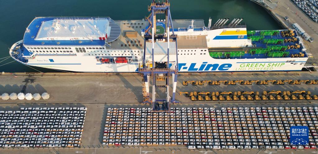 12月7日,出口商品車在山東港口煙臺港集結裝船(無人機照片)。新華社發(唐克 攝)