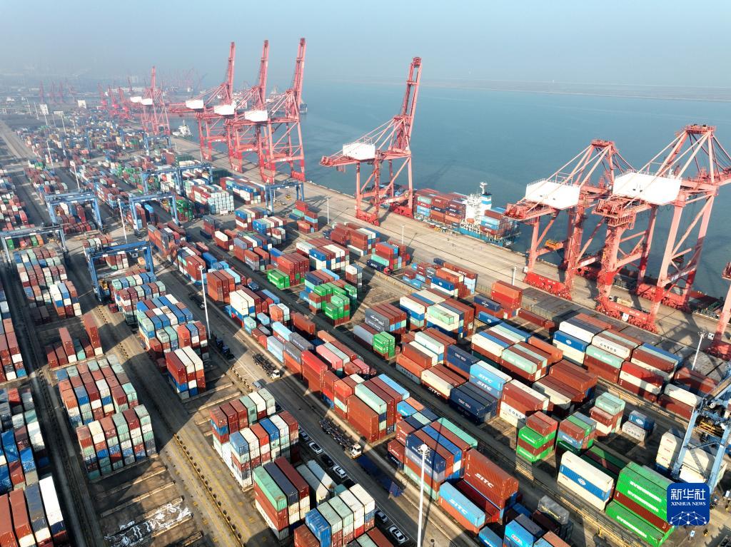 12月7日拍攝的江蘇連云港港集裝箱碼頭裝卸作業區(無人機照片)。新華社發(王春 攝)