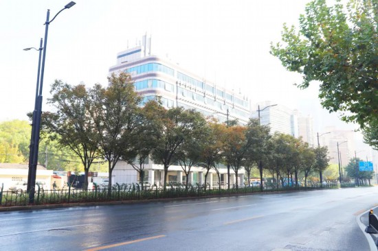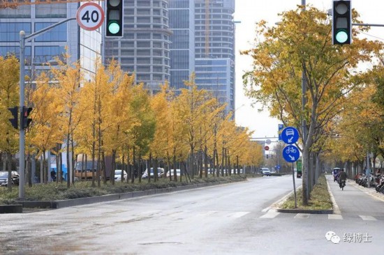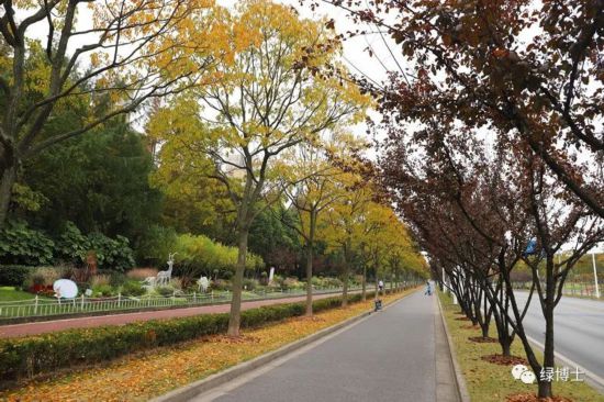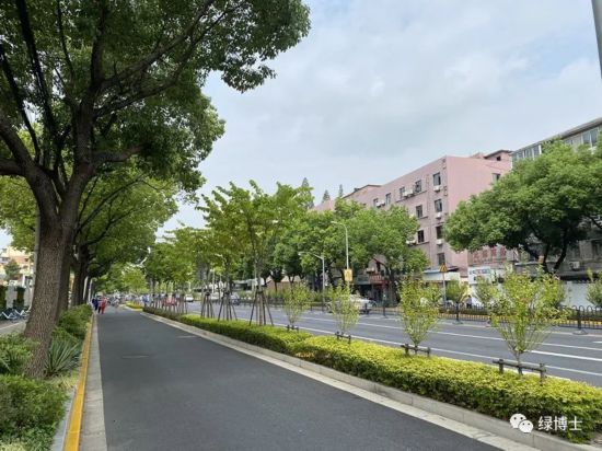 該道路為雙幅路,路段長1200米,行道樹為懸鈴木,樹形美觀,中分帶種植七葉樹、烏桕等高大喬木,下層配植北美海棠、月季等植物,豐富觀花景觀,周邊綠地綠量充足。道路以綠化為載體,增加垂直綠化及彩化植物,形成季相變化豐富、色彩繽紛的街道景觀。