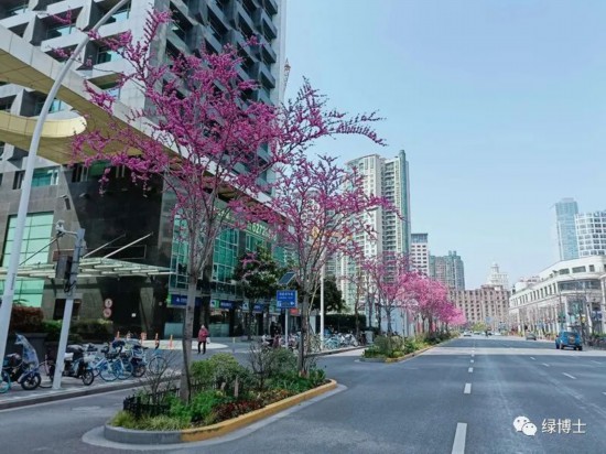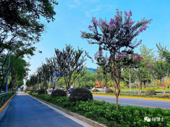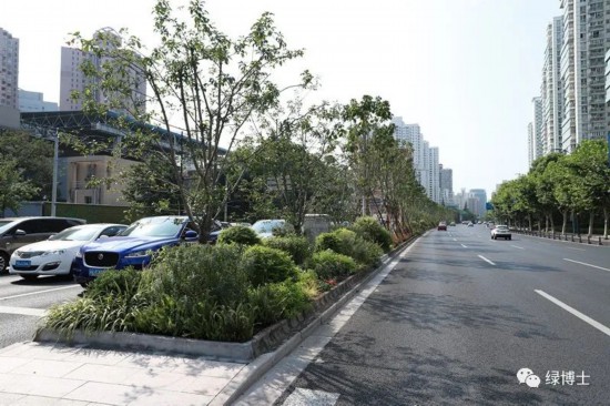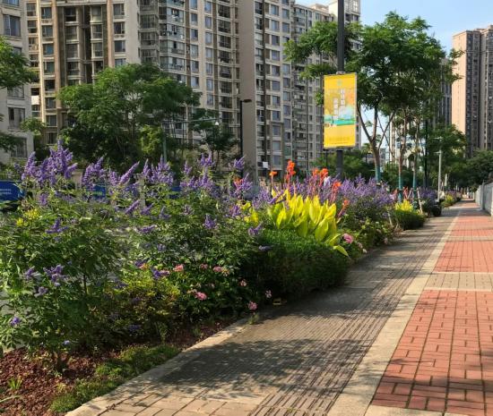 該路段長850米,四幅路,道路涵蓋中央綠島、西側綠道及東側少量綠地,綠量充足。道路通過植物優化配置調整,重點應用巨紫荊、木槿、落羽杉、紫薇、桂花、櫻花等,打造春夏兩季觀花,秋季觀色的道路景觀。