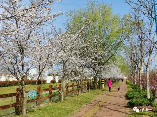 該路段長720米,四幅路,以日本早櫻作為行道樹,且在側分帶、中分帶均有種植,呈現一定景觀規模。中分帶隔10米種植無患子作為道路骨架樹種,林下叢植美人梅并弧形勾勒紅葉石楠色塊,色塊北側種植百子蓮,色塊南側種植常綠萱草,形成三季有花的特色植物景觀。