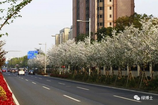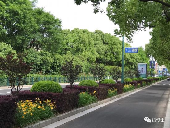 該道路為區域道路主干道,雙幅路,行道樹為懸鈴木,樹形骨架美觀,綠化改造中,中分帶保留原有櫸樹、廣玉蘭等大喬木,探索打造紅葉李嫁接美人梅特色,并布置以萱草、石蒜、八仙花為主,其它開花宿根花卉為輔的地被植物,并在沿線欄桿增設爬藤月季,豐富中央隔離帶景觀效果。