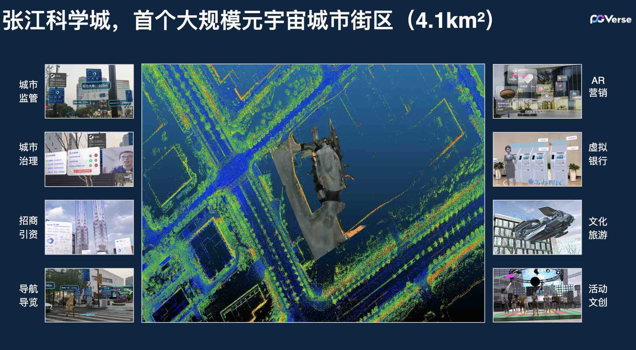 以時空AI作為開啟城市元宇宙的重要引擎,以時空AI所打造的數據底座和大數據中臺作為技術基礎,花費兩年時間,陶闖博士帶領其團隊,利用高清建圖、空間定位和感知等技術,在張江科學城中央區域完整構建了4.1平方公里“元城市”世界,將區域內辦公樓、科技園區、街道和商圈的物理空間升級為虛實融合的元宇宙空間,涵蓋了城市監管、城市治理、招商引資、城市導覽、商業營銷、虛擬銀行、文化旅游、游戲創意八大場景。