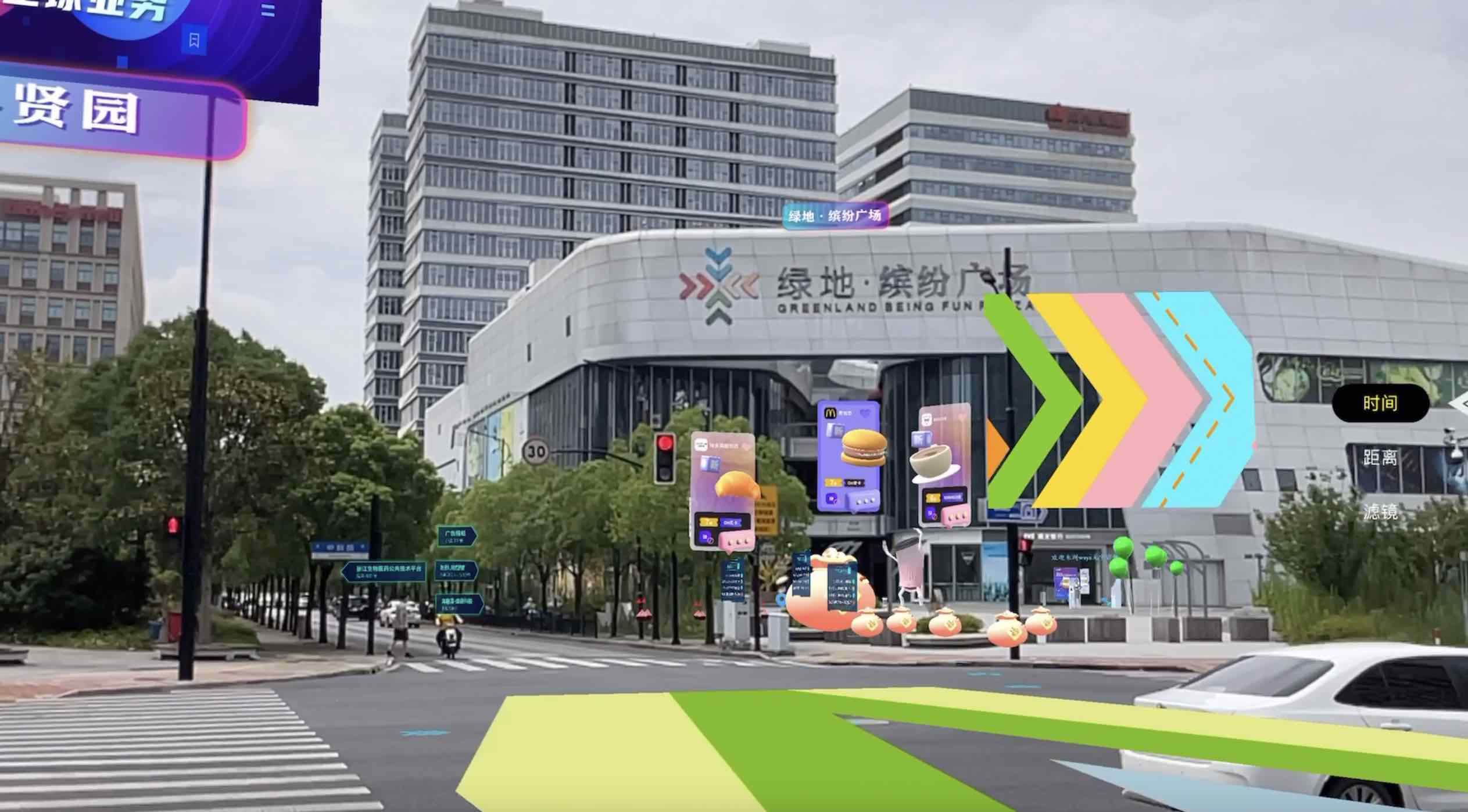 走進這個空間,將平板電腦和手機的鏡頭對準辦公樓,大樓和用戶之間的物理距離以及相關介紹、租賃信息等一一浮現眼前。路口的虛擬交通指示牌上設有廣告位,展示了元宇宙未來的廣告變現能力。廣場上,演唱會、巨型小丑、福袋和氣球等虛擬影像裝點著原先略顯平淡的物理空間,迸發出視覺上的激情與活力。
