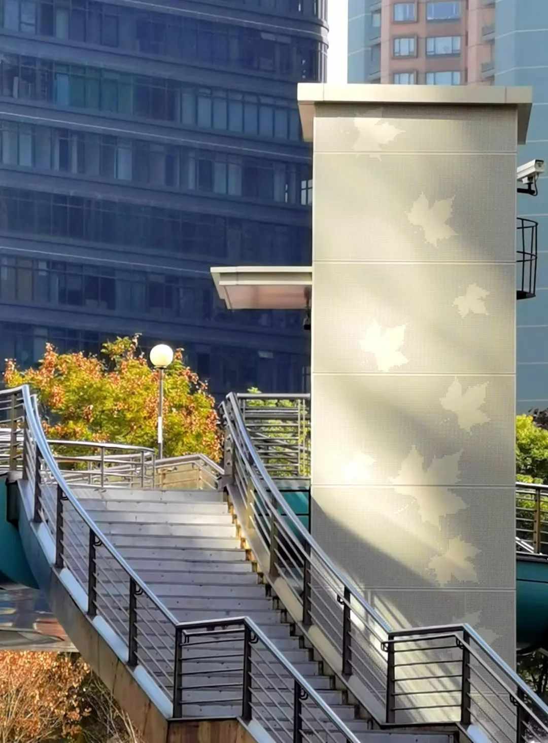 加裝電梯造型設計方面,結合江蘇路人行天橋附近建筑顏色或特色景觀進行了選材和設計,選用了白色的穿孔鋁單板板材,并在其立面設計了梧桐葉飄落的造型,與周圍景致相互融合。
