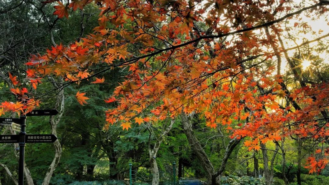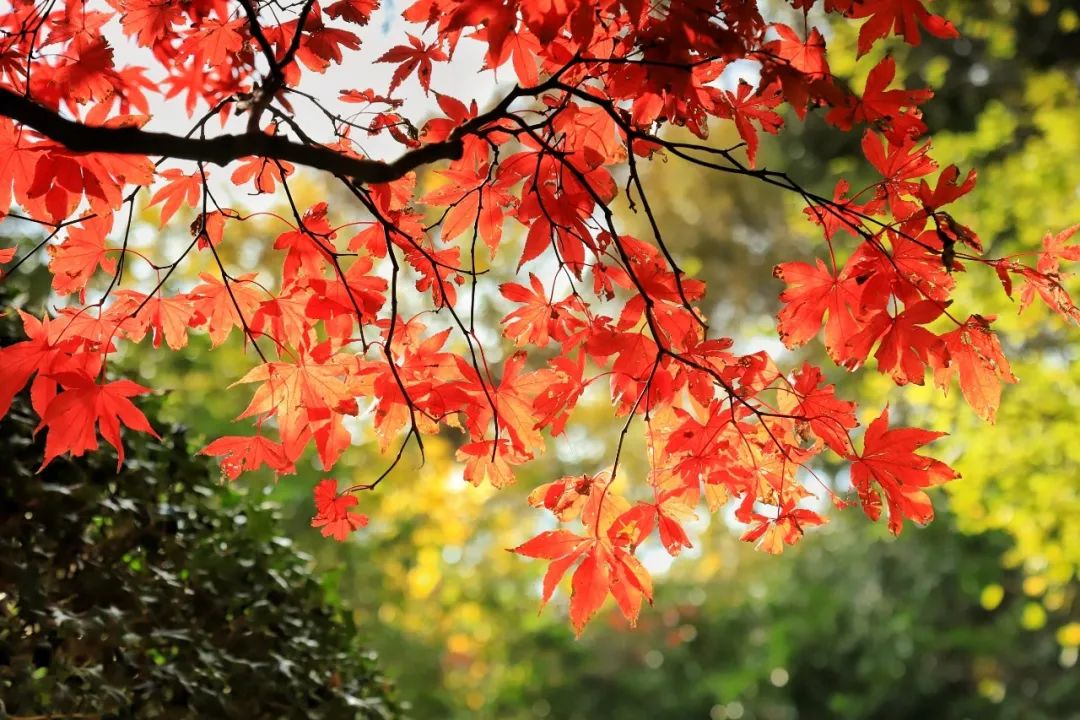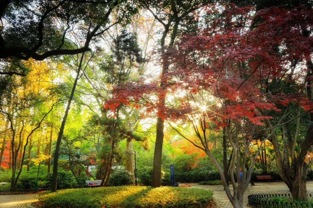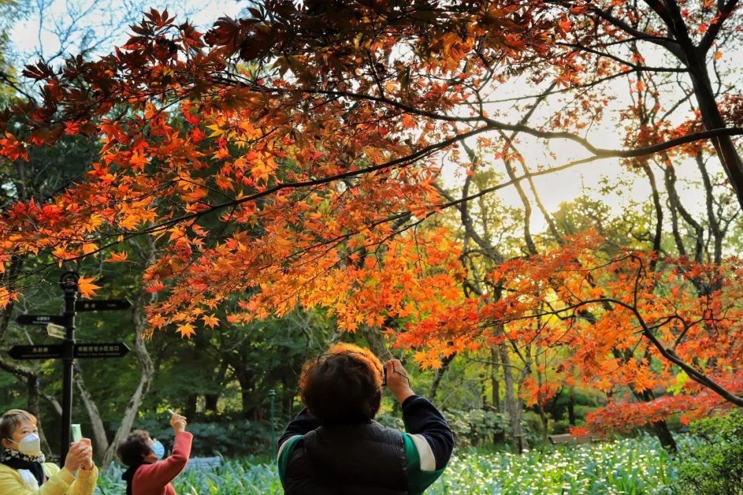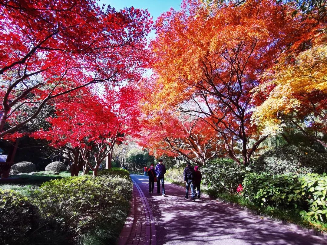 眼下的中山公園煞是好看,放眼望去,深紅、淡黃、墨綠,讓整個園子看起來美不勝收。然而最惹眼的還是火紅的楓葉,大自然饋贈的這些“小精靈”在陽光下肆意伸展,甚至比春花還要熱鬧。