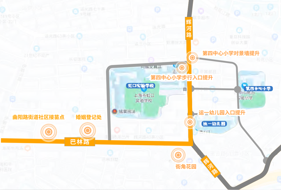 小虹了解到,美麗街區一共設計了6個點位,以輝河路和巴林路兩條道路為主要載體,包括輝河路兩側分布著的民辦第四中心小學、虹口實驗學校、運一幼兒園三個點位,和巴林路邊曲陽路街道社區接苗點、婚姻登記處、街角花園三個點位。