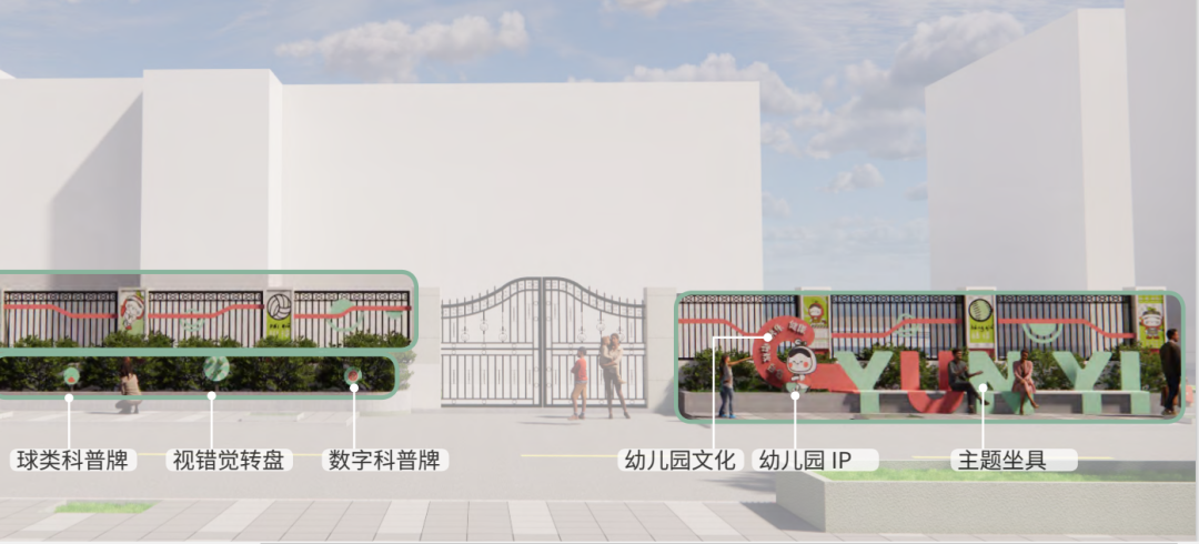 幼兒園外側人行道過于狹窄且綠植豐茂,設計時將重點放在了圍墻外觀的立面提升。通過立面墻繪 + 欄桿貼畫裝飾 + 樹池提升三層立體設計,沿途設置運動主題墻面手繪、幼兒園 IP、主題坐具、數字科普牌、球類科普牌、視錯覺轉盤等,增加趣味互動設施。