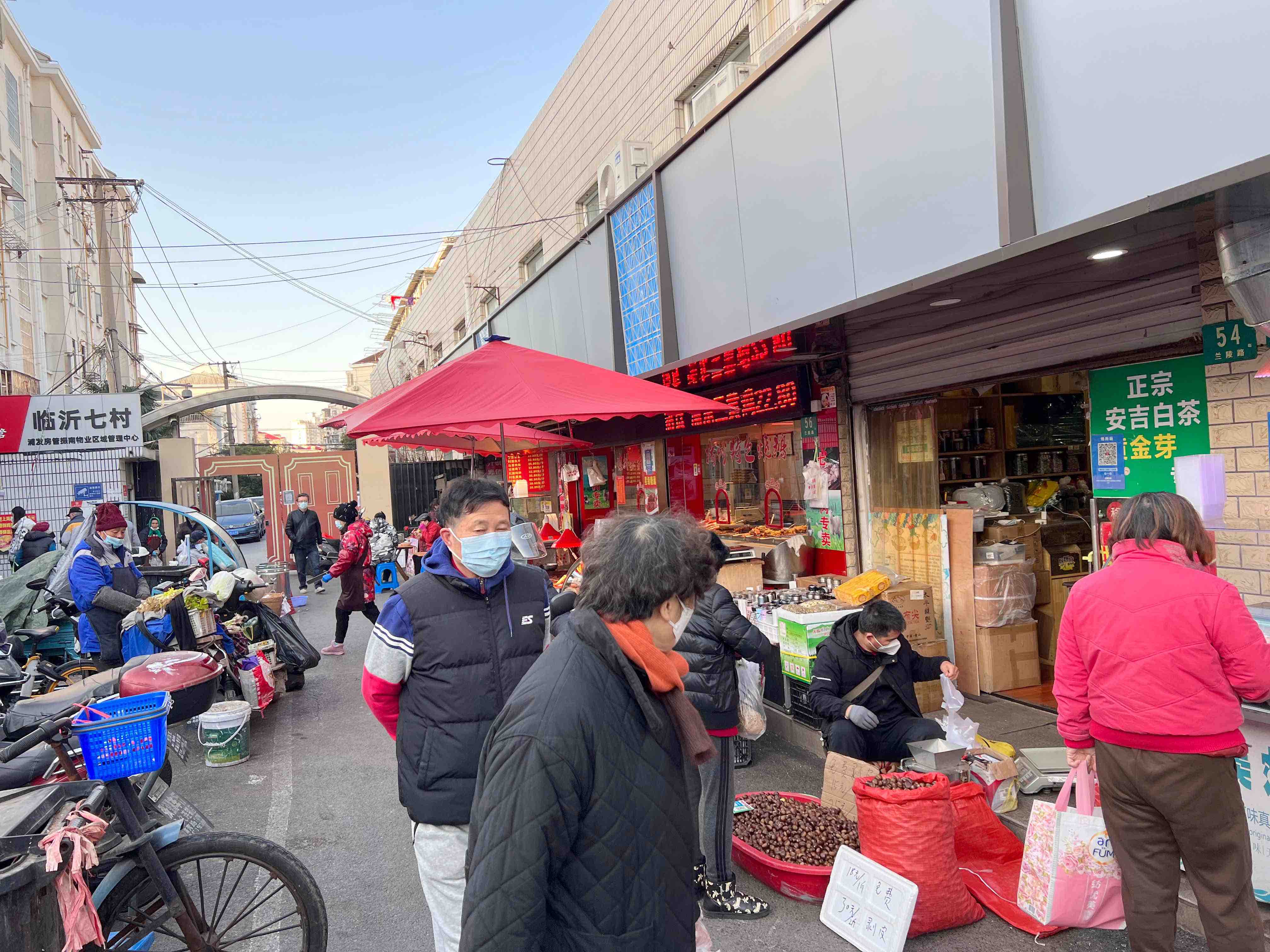 12月15日上午8時,上海浦東新區蘭陵路集貿市場。很多送完孩子上學的家長及附近居民會選擇在此采購。集貿市場室內采購者較少,而室外買菜者較多。