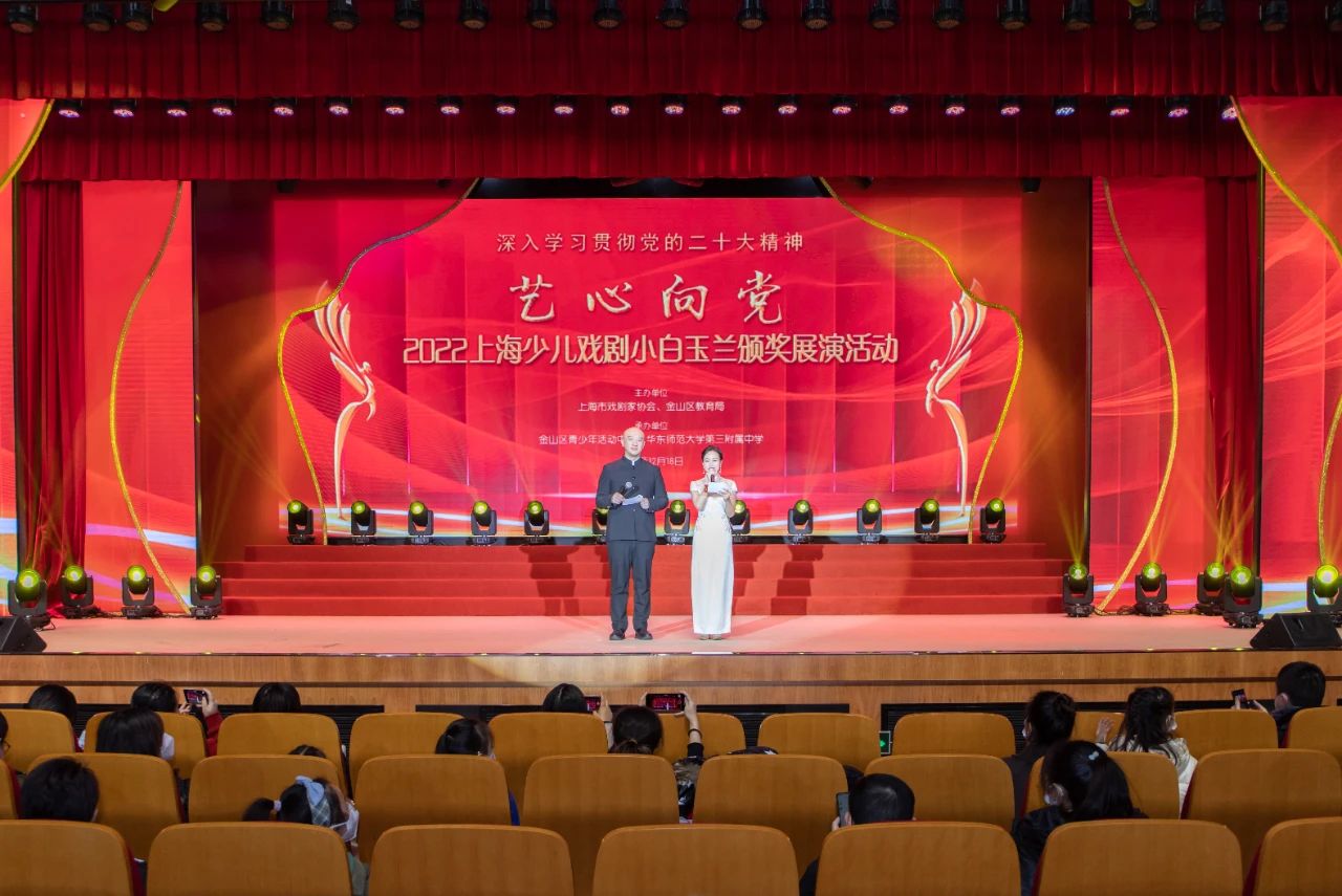12月18日下午,2022年上海少兒戲劇“小白玉蘭”頒獎展演活動在華東師范大學第三附屬中學舉行。今年的小白玉蘭獎參賽人數、獲獎人數創歷屆之最,近300組節目參加評選,其中,共有42人榮獲“小白玉蘭”稱號提名;77人榮獲“小白玉蘭”稱號;8人榮獲“優秀園丁”稱號;21個集體節目榮獲“優秀集體節目”稱號;3家單位榮獲“優秀組織獎”。不少金山學子和集體節目獲獎,并上臺展演。