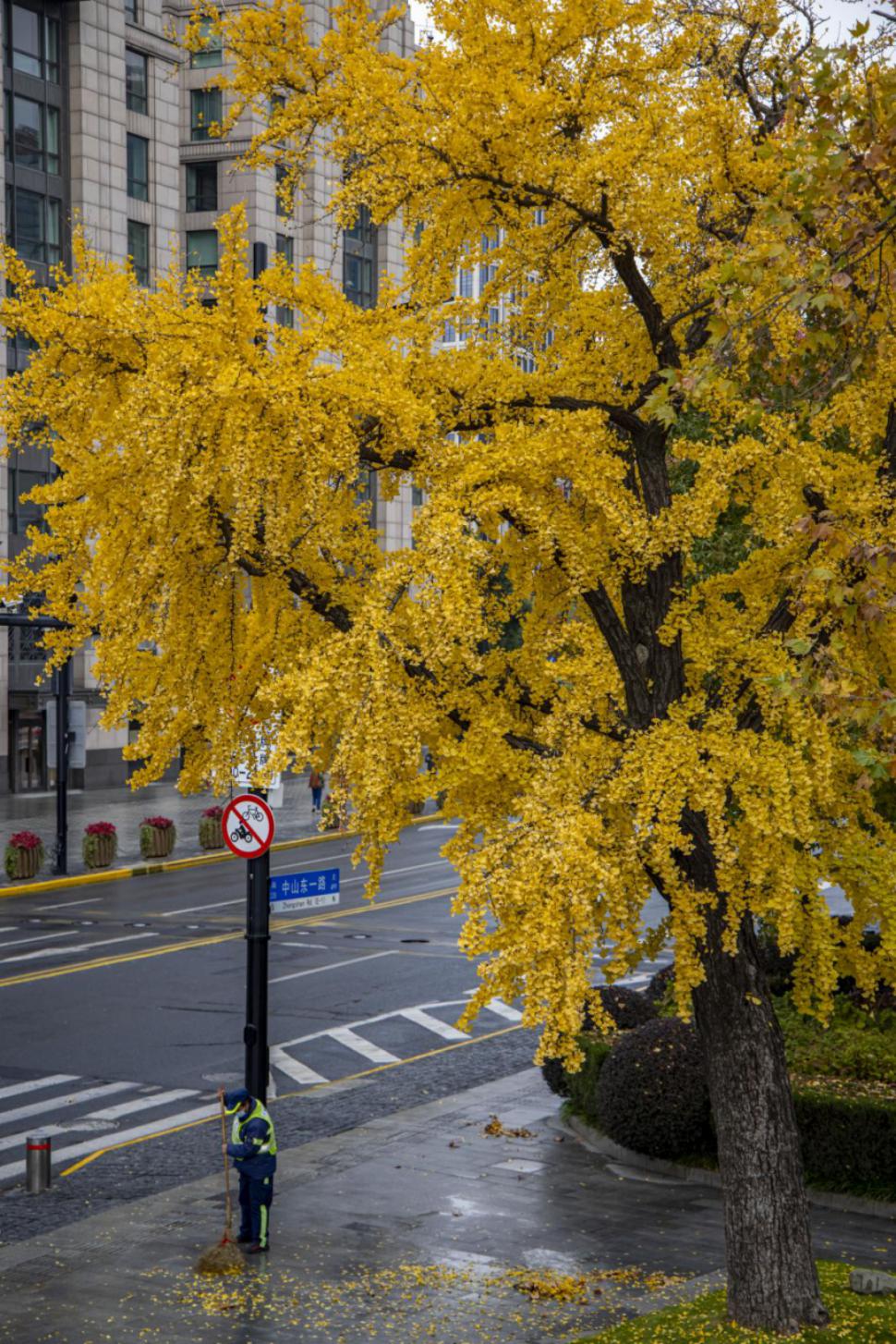 外灘附近的銀杏樹,一樹燦爛,一地金黃