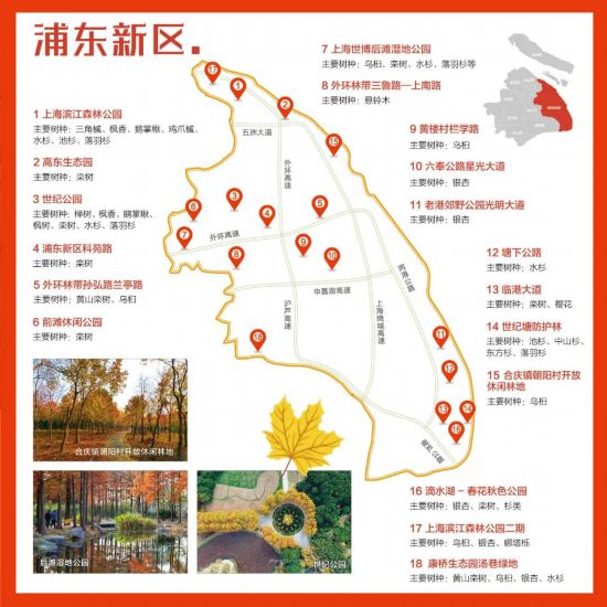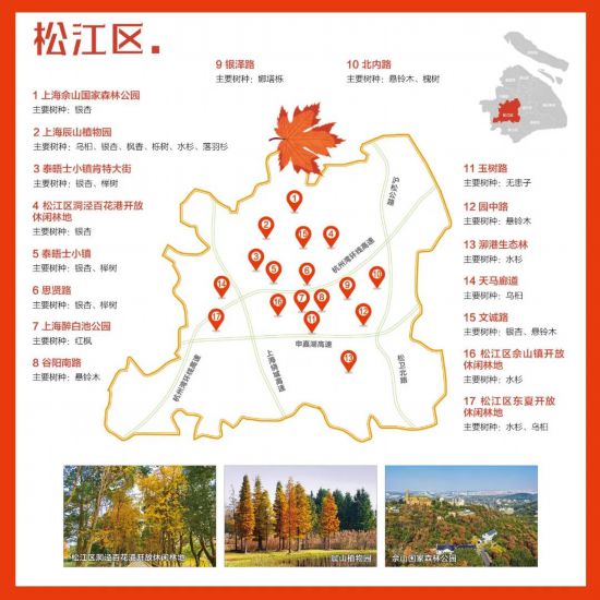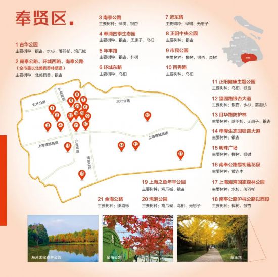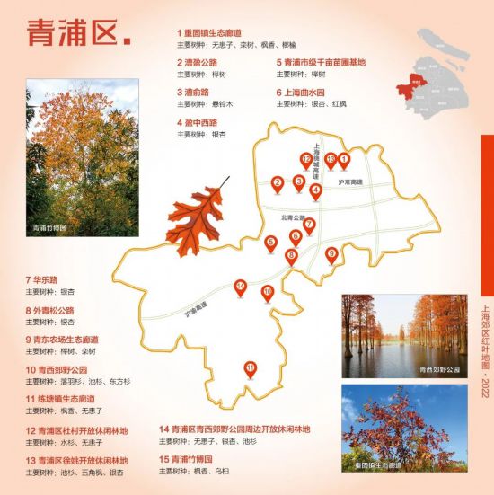 不知不覺,初冬已至。金黃的銀杏大道、古樸的懸鈴木老街、火紅的楓香林、雄壯的水杉林……申城再一次展現斑斕美景。為滿足市民森林游憩需求,提供更多更好的生態活動空間,今年,市綠化市容局、市林業總站再度為大家奉上郊區紅葉地圖。地圖中標注了上海9個郊區的色葉觀賞點,包括林地、苗圃、公園、道路等多個類型。詳見↓