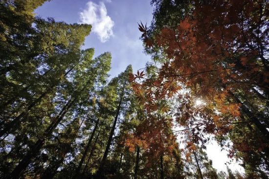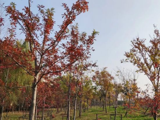 閔行區涇彩林開放休閑林地位于閔行區吳涇鎮,設施完善、林下改造景觀良好。初冬時節,林地內娜塔櫟鮮紅奪目,樹木挺拔,用一片熱情的火紅牢牢抓住游客的眼睛。