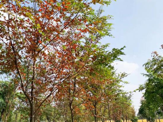 重固鎮生態公益林四時皆有景,景景各不同。娜塔櫟與櫸樹,在初冬時節顯示出新的色彩,鮮紅的樹葉在陽光下熠熠生輝,真是樹樹皆美景。