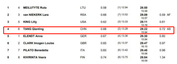比賽中,唐錢婷在前半程第一個25米全力沖刺,排名第二。轉身之后,唐錢婷目測距離和其他選手非常接近,在沖擊階段,立陶宛選手梅盧蒂特優勢明顯,最終,唐錢婷以29秒22打破亞洲紀錄的成績,遺憾獲得第四名。