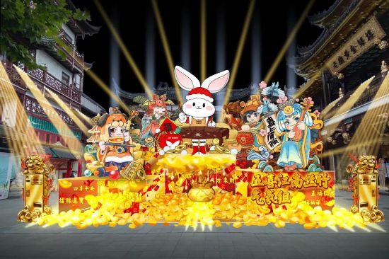 豫園外圍同樣新年氛圍滿滿,校場街區選取滬上八景中位于老城廂的三景:鳳樓遠眺、黃浦秋濤、石梁月夜,力爭復刻還原老城廂新年的景致;校場門頭上,兩只功夫兔正在對戰,集裝箱店鋪周圍也有兔子圍繞觀戰,好不熱鬧。市民游客置身其中,感受老城廂繁華與喧鬧,追憶故景綺夢。