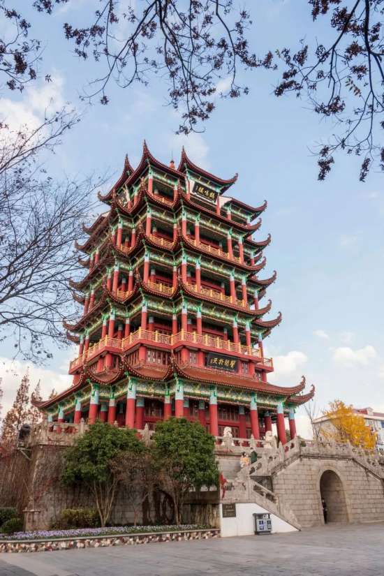鶴鳴樓的建造非??季?,上用琉璃蓋頂、下砌玉石平臺,遠遠望去氣勢非凡。與它合影的最佳地點就在一旁的雙誼橋上,既能把樓拍全,還有綠樹環繞。