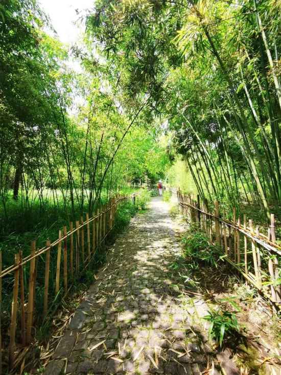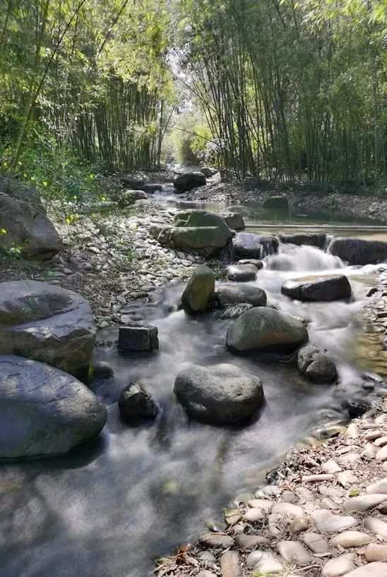 公園里有一片靜謐的竹林,曲徑通幽處,點點綠光,身處其中,讓人不禁身心舒暢。順著竹林一直走又會發現一個天池,通過人造山坡鑿出山澗溪流。