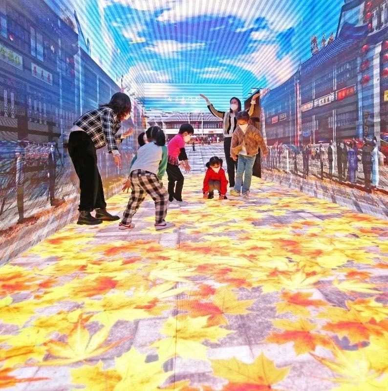 一樓的最后一個展區“夢回百年”,通過手繪半景畫與投影相結合的墻面,構成楓涇古鎮清末時期街道商貿生活場景,也成為了網紅打卡點。