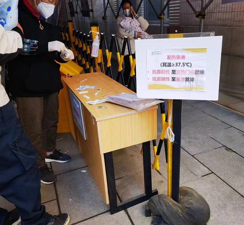浦東新區北園路的兒童醫學中心?;颊哌M入急診首先需要測耳溫。如果高于或等于37.5℃,不需要查驗核酸陰性證明,但要在現場做抗原檢測,如果陰性可至急診就診,如果陽性需改往位于東方路的發熱門診就診。