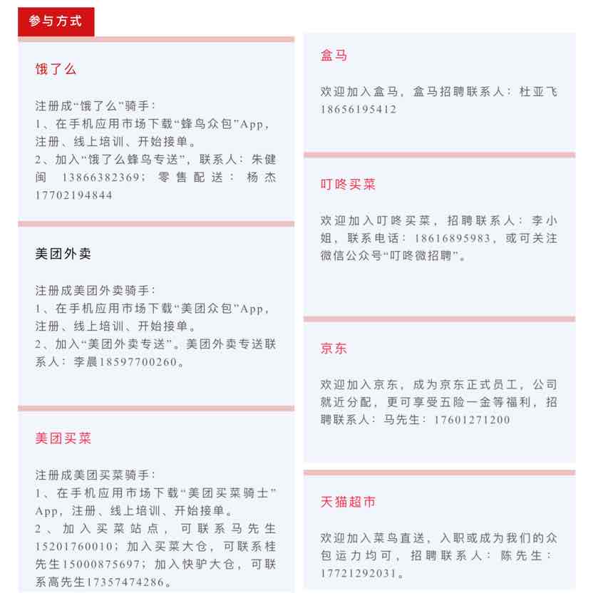 餓了么、美團、叮咚買菜、京東、天貓超市等眾多平臺,都在擴大招聘范圍、新增騎手返崗、積極招募新人騎手、加強新人培訓,以增加運力。