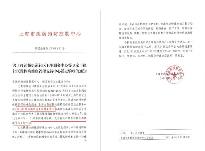 獲得上海市社區慢性病健康管理支持中心