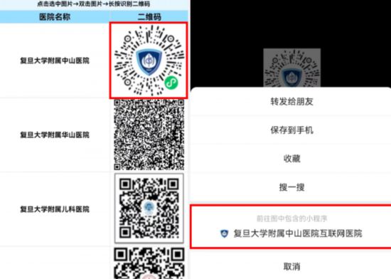 雙擊每個醫院的二維碼,查看原圖后,長按識別二維碼或保存二維碼微信掃一掃,可登錄互聯網醫院。