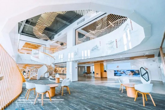 8樓入口處層疊的玻璃勾勒出潮起潮涌的蘇州河水,岸邊中央造幣廠舊址、環球港、元代水閘博物館等蘇州河畔地標建筑剪影傾訴著千年之后一段段普陀蝶變的嶄新傳奇。