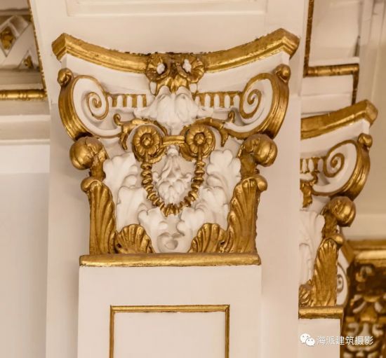建筑內部裝飾呈現出文藝復興風格,護墻、柱身、樓梯及欄桿等木雕裝飾做工精巧;室內多處采用繁復的石膏平頂,精美華麗。