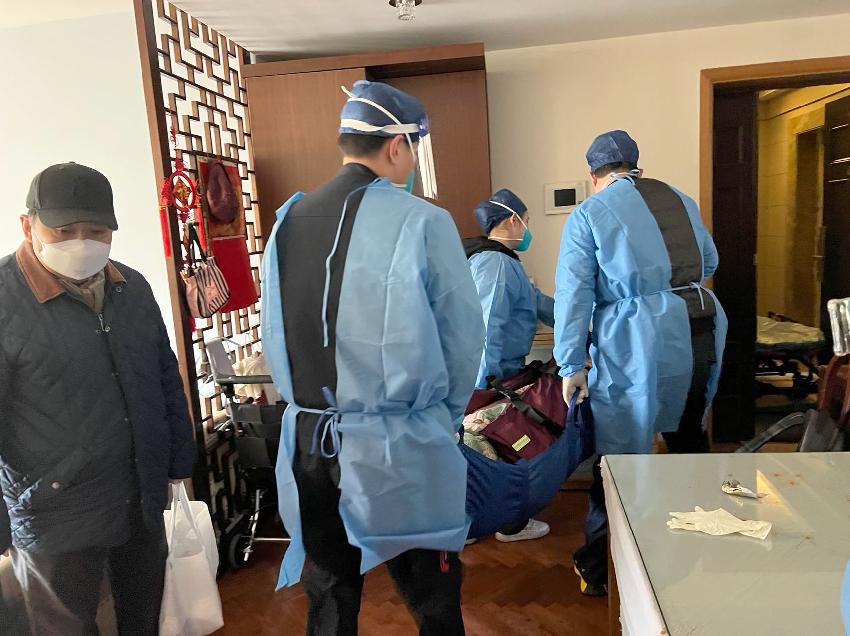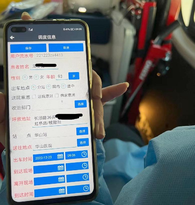 剛上車,方晨潔拿出電話再次與患者家屬溝通:一名79歲的奶奶在安順路一處樓房的5樓衛生間摔倒,不能走路,要求前往中山醫院救治。方晨潔提醒同車搭檔,患者目前抗原陰,但是位血透患者。8:15分,擔架車通過電梯來到患者家中。