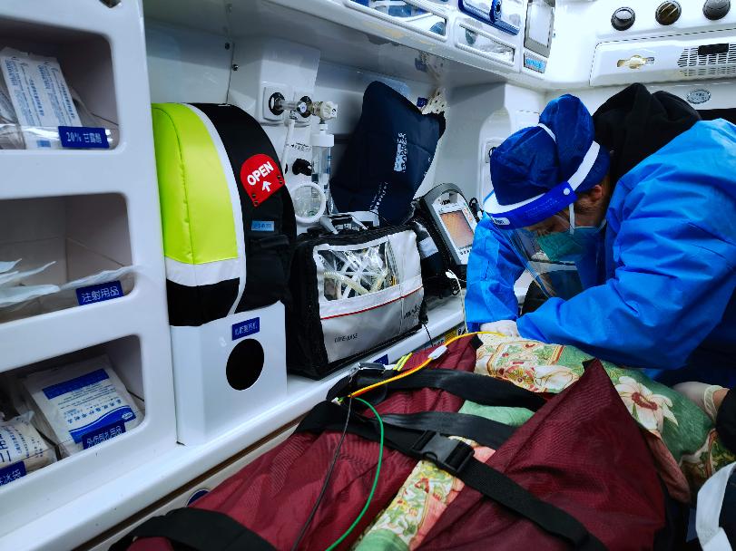 放在地板上的急救箱,凳子上的急救包,床上的氧氣包和監測儀器,讓本就狹小的室內顯得擁擠,但急救小分隊三名隊員擠在一起,分工協作有條不紊,