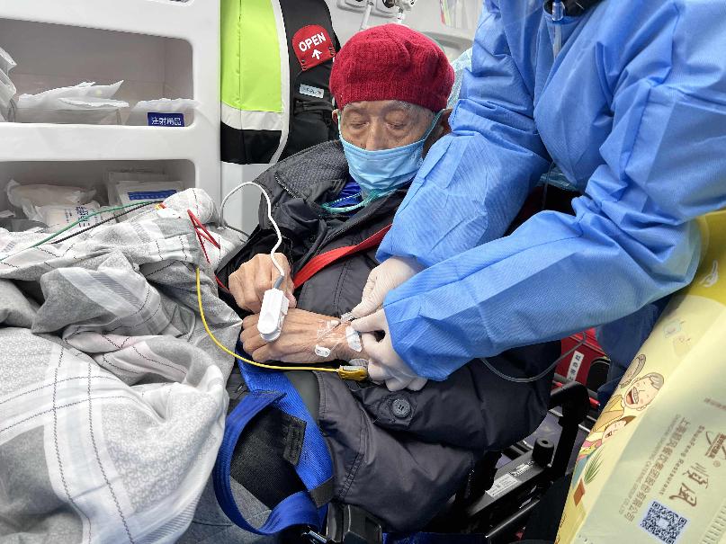 量血壓、測心率、測血氧飽和度、吸氧、打好留置針……一系列檢查和溝通后,方晨潔判斷,這位93歲高齡的患者情況還算穩定,可以適當穿好衣服后前往醫院。