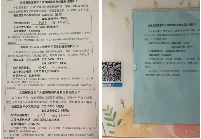 在解決用餐問題的同時,丁晨佳也不忘老人們的就醫需求。上周,丁晨佳制作了一批“緊急就醫友情提示卡”,張貼在居民區內各樓棟里,并提前發動居民區干部將卡片送至高齡、獨居老人手中??ㄉ蠘俗⒘松虾?4小時發熱咨詢熱線、街道社區衛生服務中心熱線、家庭醫生及居委會聯系方式等信息,只要老人有需要,就可以隨時、及時地聯系到居委會或醫院,做到有備無患?!拔覀冊谖⑿湃豪镆舶l了這些消息,但很多高齡老人并不會使用手機,所以還是又做了紙質版卡片,讓他們放在自家的電話旁邊,有問題可以第一時間聯系?!?/p>