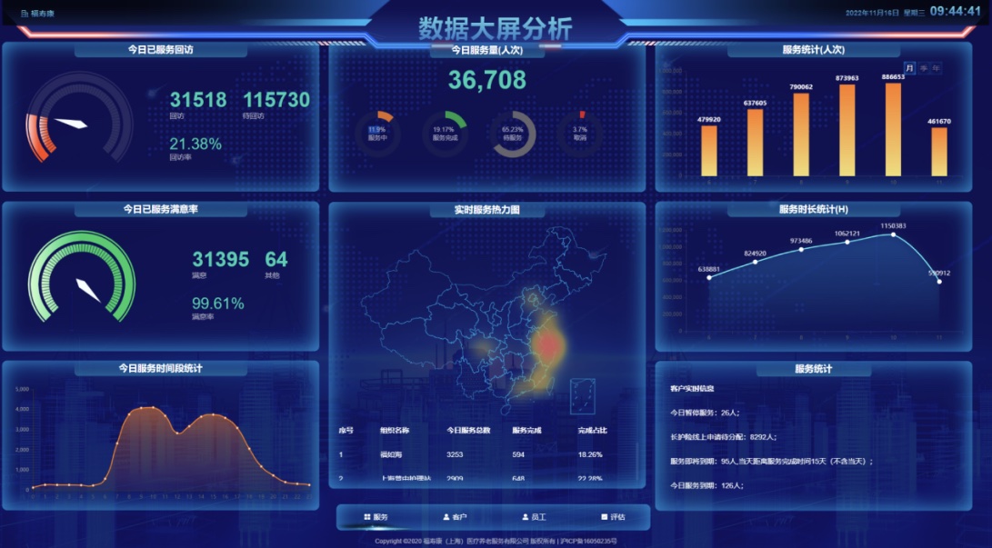 福壽康以技術和標準為核心,自主研發業內領先的智慧養老服務運管理系統平臺,打造“互聯網+醫護康養”服務模式,以信息化手段為支撐,搭建以長者為中心的全方位健康數據中臺,結合智能終端設備、照護管理CRM及智能化培訓體系,深度挖掘和響應老人需求,為老人提供優質、便捷的一站式醫護康養服務。